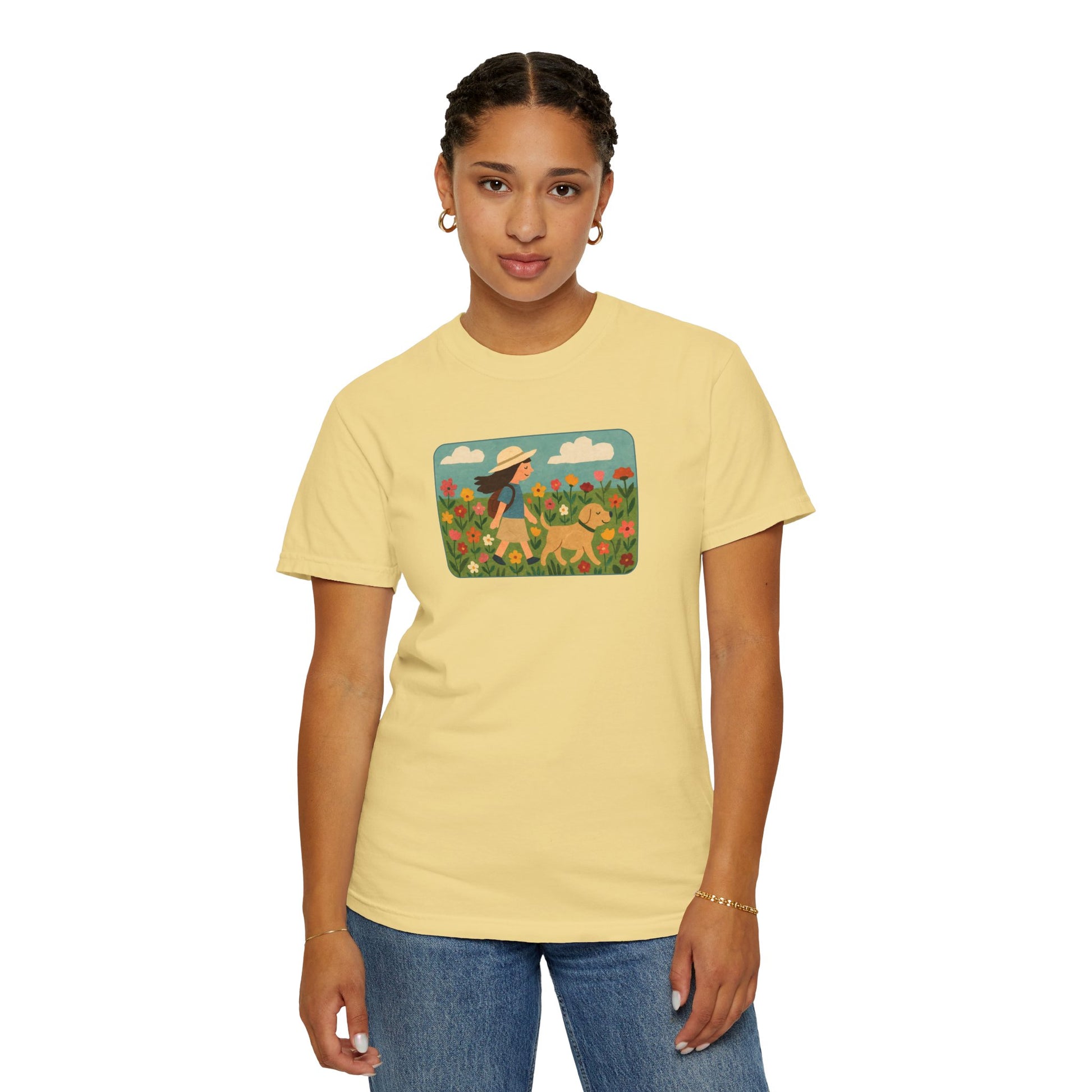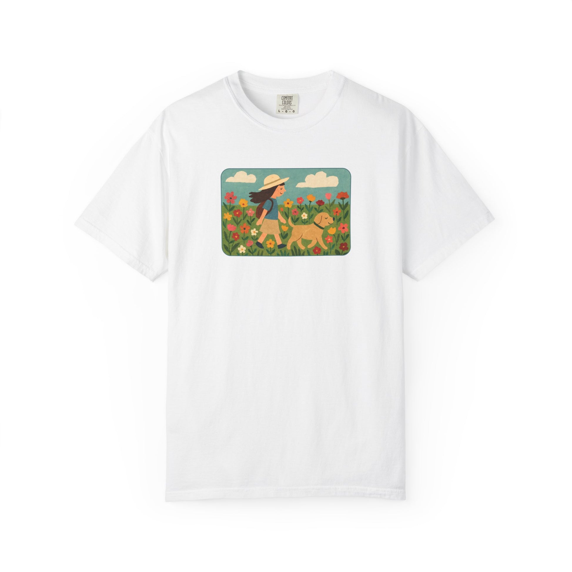 A collage-inspired unisex garment-dyed T-shirt featuring a girl walking her dog. This comfortable tee is perfect for casual wear and adds a touch of artistic flair to any outfit. Ideal for dog lovers and those who appreciate unique, hand-drawn designs. Suitable for everyday wear, dog walking, casual outings, and art lovers.