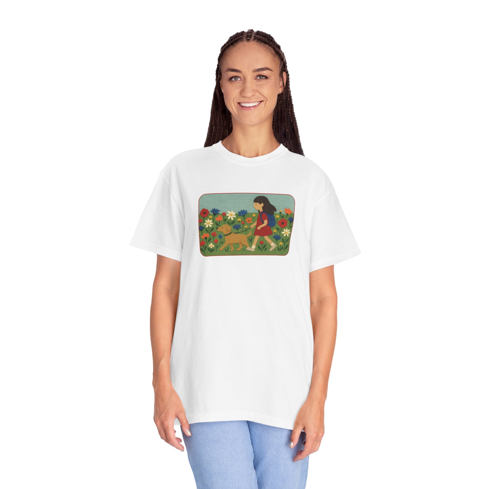 A collage-inspired t-shirt featuring a girl walking her dog, giving off a laid-back and artistic vibe. Perfect for dog lovers and art enthusiasts, this t-shirt is ideal for casual wear or as a statement piece. Great for everyday wear or as a thoughtful gift for birthdays, holidays, or any special occasion.
