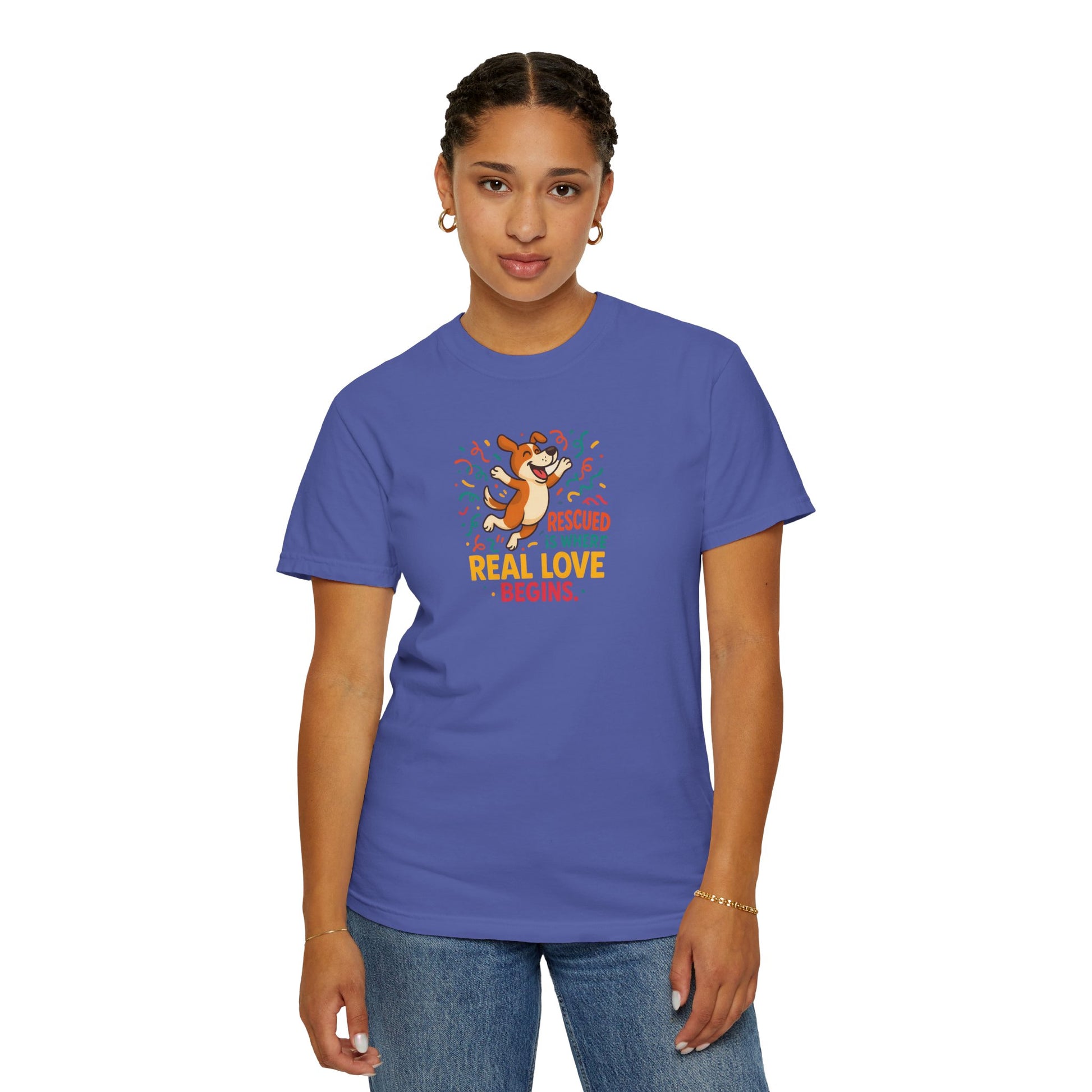 This unisex garment-dyed t-shirt combines comfort with a heartwarming message, making it an ideal addition to any casual wardrobe. The soft, relaxed fit provides ease and style, perfect for everyday wear or a fun night out. Whether you're enjoying a laid-back day or meeting friends for coffee, this tee is versatile and trendy. It’s sure to resonate with animal lovers and advocates, reminding them of the joy that comes from rescue and companionship. A wonderful choice for holidays, celebrations, or simply to wear on weekends, this shirt can be a thoughtful gift for pet owners, adoption anniversaries, or just because. Embrace the feeling of love and community with this charming design!